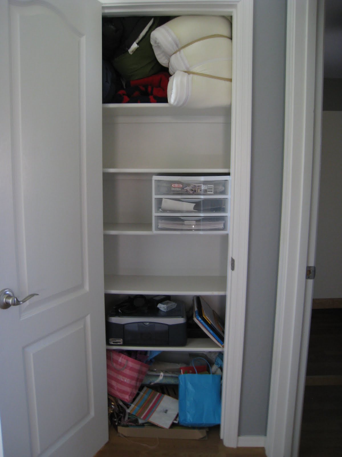 Shelves moved from the office closet to the laundry room (okay, laundry closet), and the linen closet, where you can see our infrequently-used-and-so-relegated-to-the-closet printer (it should be easy enough to plug in the printer and laptop once in a while when we actually print something). The stuff next to the printer is our mailing stuff for a newsletter we help print a few times a year. The gift wrap is what's piled on the bottom. More craft stuff to go in here.